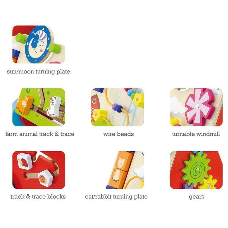 Get their walking off to a bright start with this Activity Walker, packed full of exciting and entertaining activities that are sure to provide hours of playtime fun! Including farm animal track & trace, wire beads, turnable windmill, sun/moon turning plate on the front and gears, track and trace blocks on the sides.