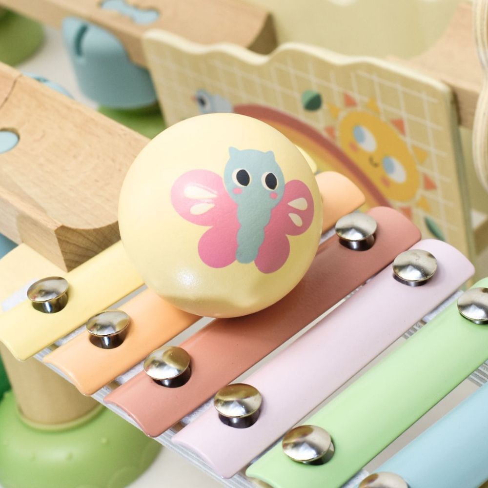 The My Forest Friends Ball Drop Track Set from Tooky Toy is delightful set featuring a captivating rolling ball tower that promises endless fun for your little ones. Simply place one of the four colourful wooden balls at the top and watch as it spirals down, creating a mesmerizing journey. As the ball descends, it crosses the xylophone bridge, producing charming musical notes, hits a cymbal, and tumbles down the stairs before finally turning around to land back at the base of the tower.