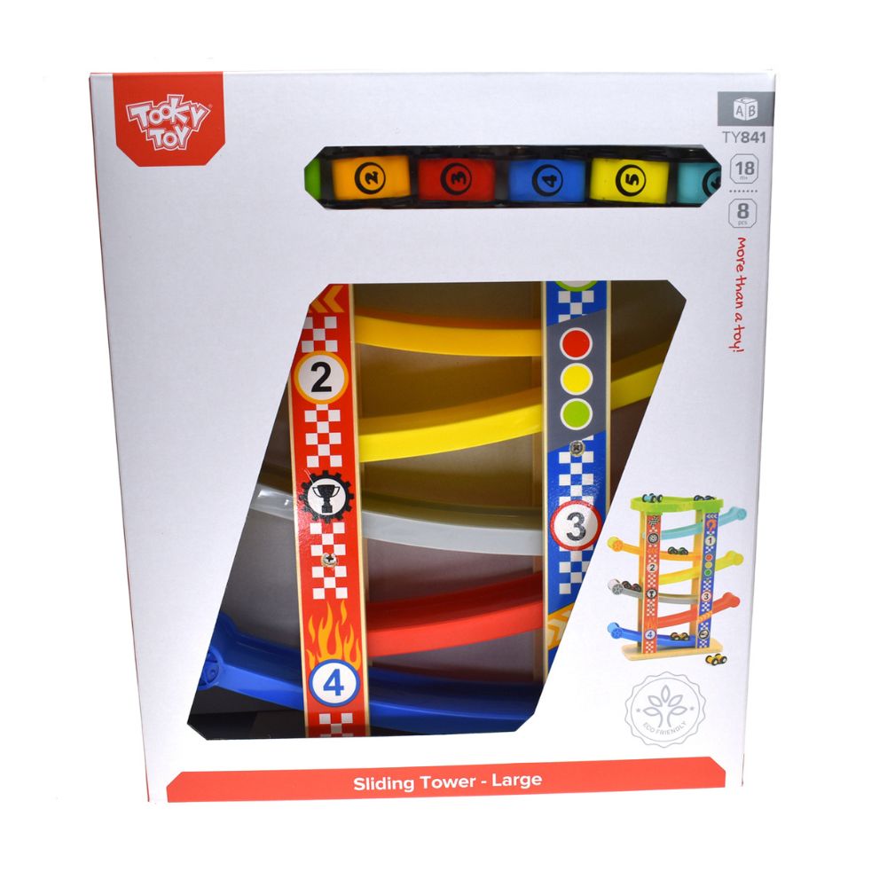 Race into endless fun with the Tooky Toy Large Sliding Tower Car Run! This exciting and vibrant toy features six colourful plastic ramps that twist, flip, and slide, offering thrilling car races for your little speedsters. Simply place one of the included cars at the top of the tower and watch as it zooms down, tumbling and turning through the track, creating a mesmerising display of motion. The set comes with six cars, perfect for racing against friends or setting up a variety of racing challenges. The rooftop parking area serves as the perfect starting point, allowing your child to launch their cars down the ramps for high-speed fun. At the end of the track, the cars soar off the final ramp, adding an extra level of excitement to the race. Made from a combination of sturdy plastic and timber, this sliding tower is designed for durability and hours of fun. It is painted with child safe, non-toxic paint, making it a safe and entertaining addition to your child's playtime. Whether racing for speed, distance, or simply for fun, the Large Sliding Tower Car Run is sure to provide endless enjoyment.
