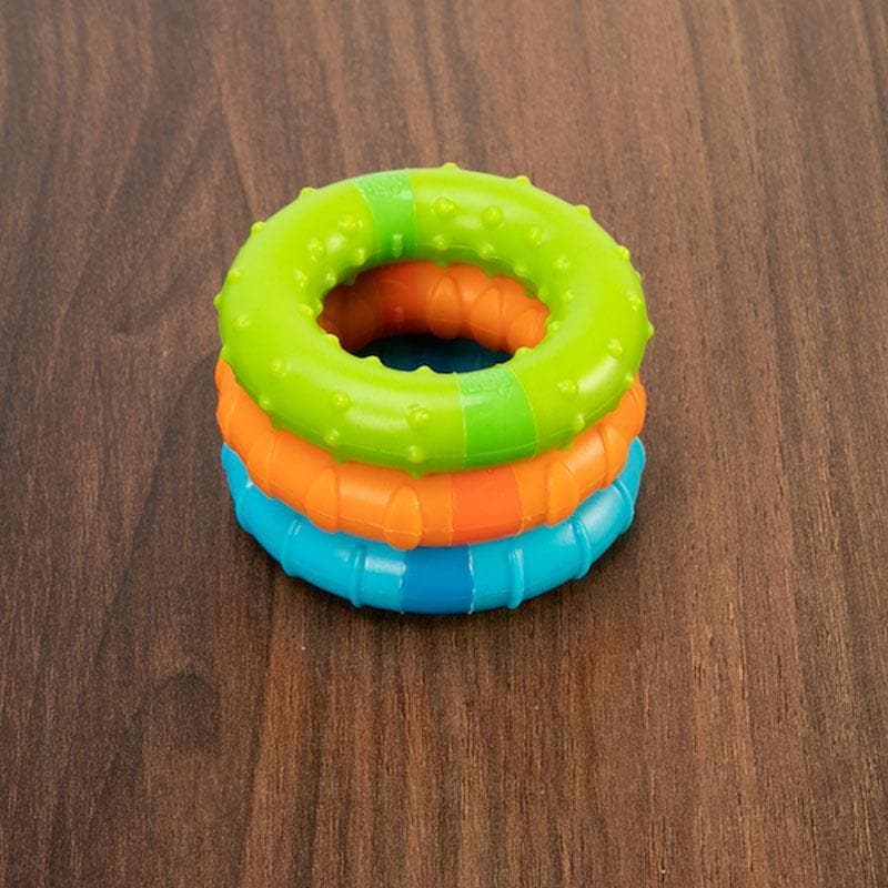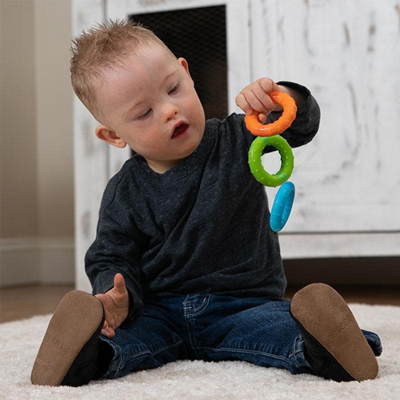 Each ring is covered in a soft, rubbery material, features unique textures for the fingers to explore, and has a built-in rattle that delights the ears.
