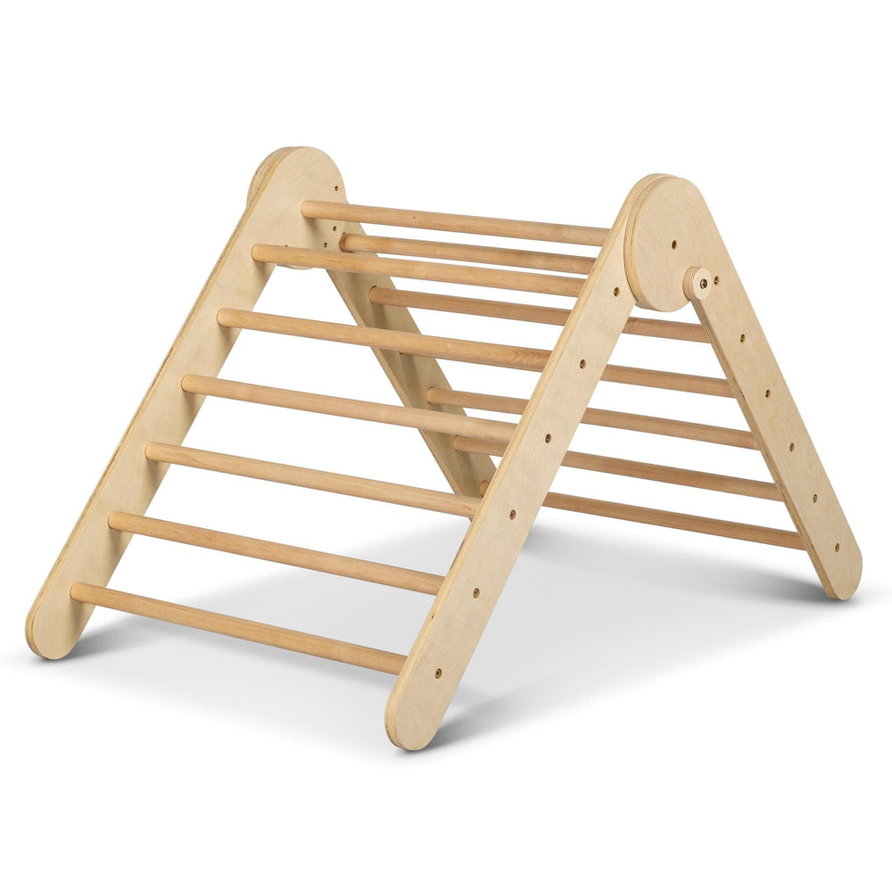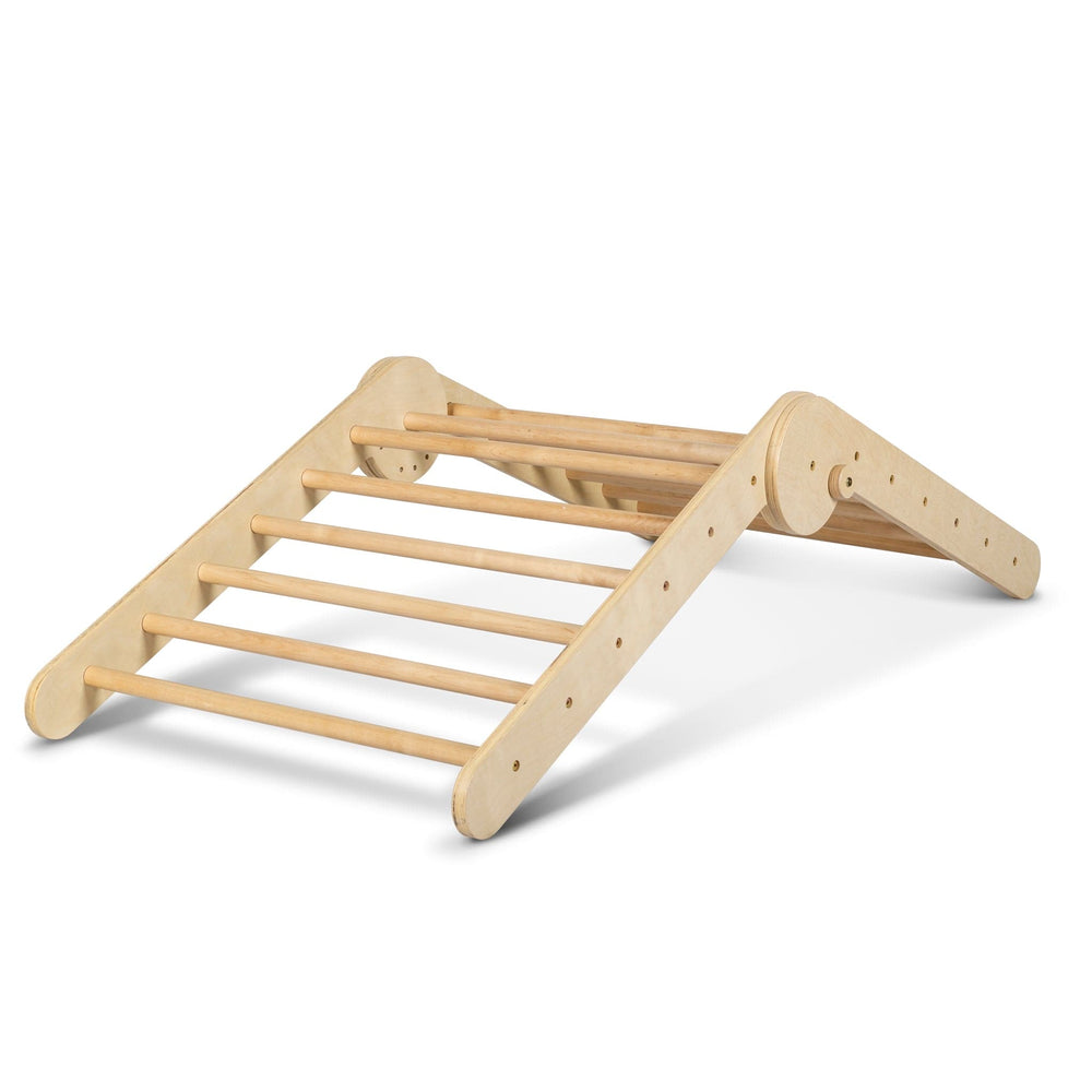 This climbing triangle is inspired by the work of Hungarian pediatrician Emmi Pikler, who believed that children should be allowed to develop at their own pace and encouraged to explore their environment. Pikler developed a range of equipment, including climbing frames, that were designed to help children build their strength, coordination, and confidence.