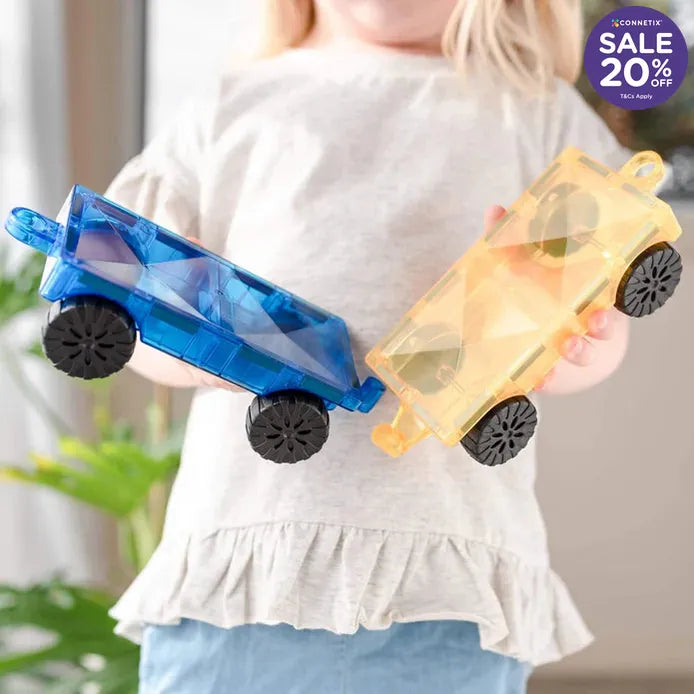 The Connetix Tiles 122 Piece Pastel Creative Car Bundle includes the beautiful 120 piece pastel creative pack and 2 piece car pack.