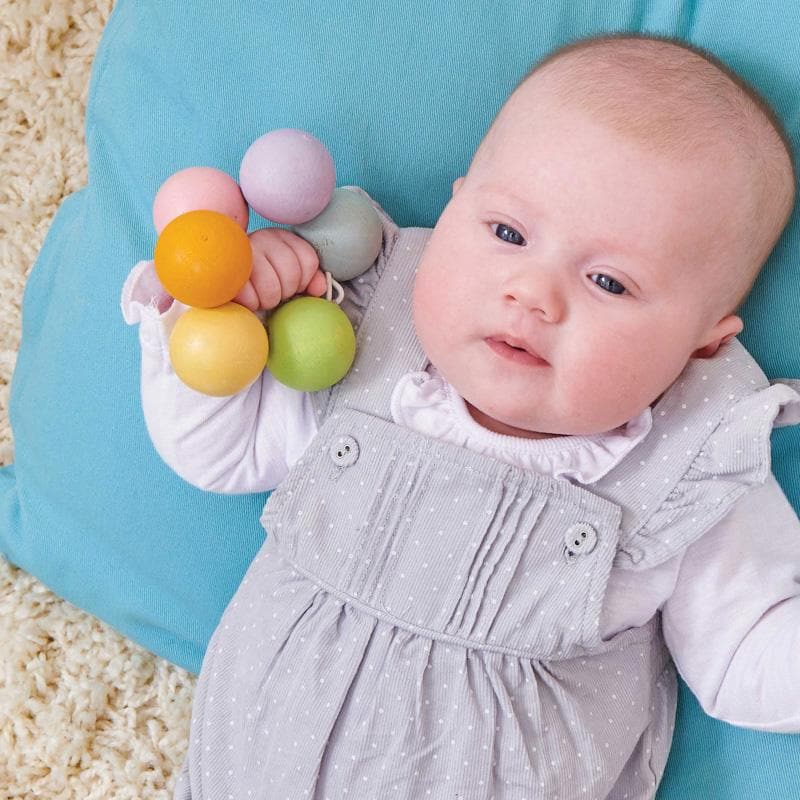 A colourful collection of 6 wooden beads that are connected by a secure elastic string that allows for movement. Great for soothing a teething baby.