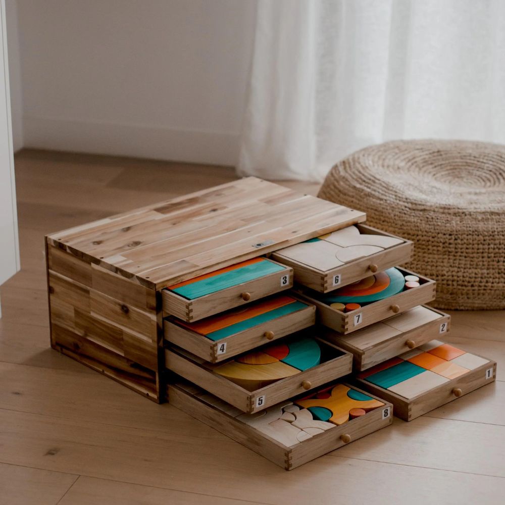 The set is housed in a cabinet for storage. All Qtoys are made of plantation timber using non-toxic and child-safe materials.