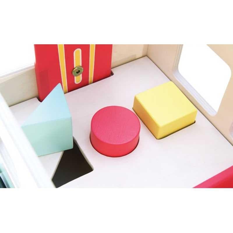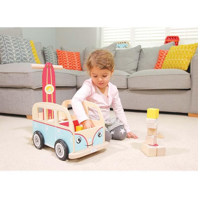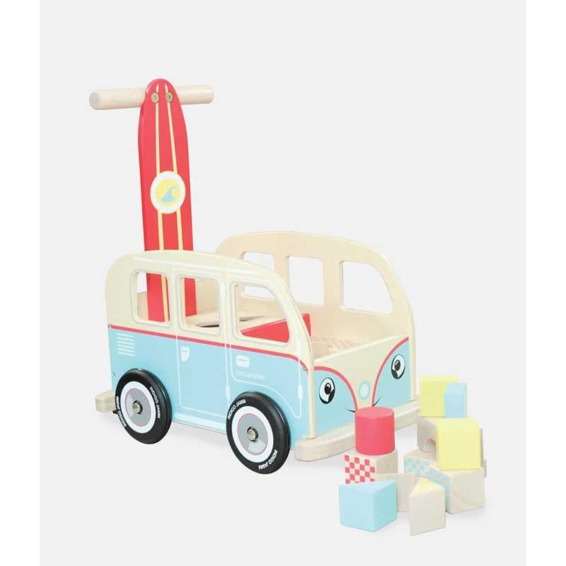 A retro Camper Van walker with chunky wheels and a surfboard handle. Complete with 14 shaped, solid rubber wood blocks and a shape sorter at the rear to sort circles, squares and triangles. Experience endless fun and learning with the Colin Walker Van.