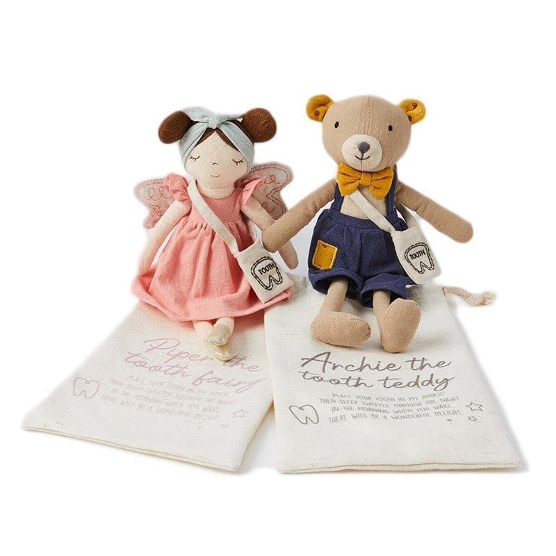 Piper the Tooth Fairy & Archie the Tooth Teddy may be the most fun and exciting way to commemorate a child’s milestone! These adorable ‘I Lost My Tooth’ soft toys are ideally paired with their very own ‘Tooth Fairy’ & ‘Tooth Teddy’ fabric pouches, in which little ones can carefully store their lost tooth and sleep sweetly through the night knowing that a wonderful delight awaits them in the morning. A beautiful way to create a cherished moment between parent and child.