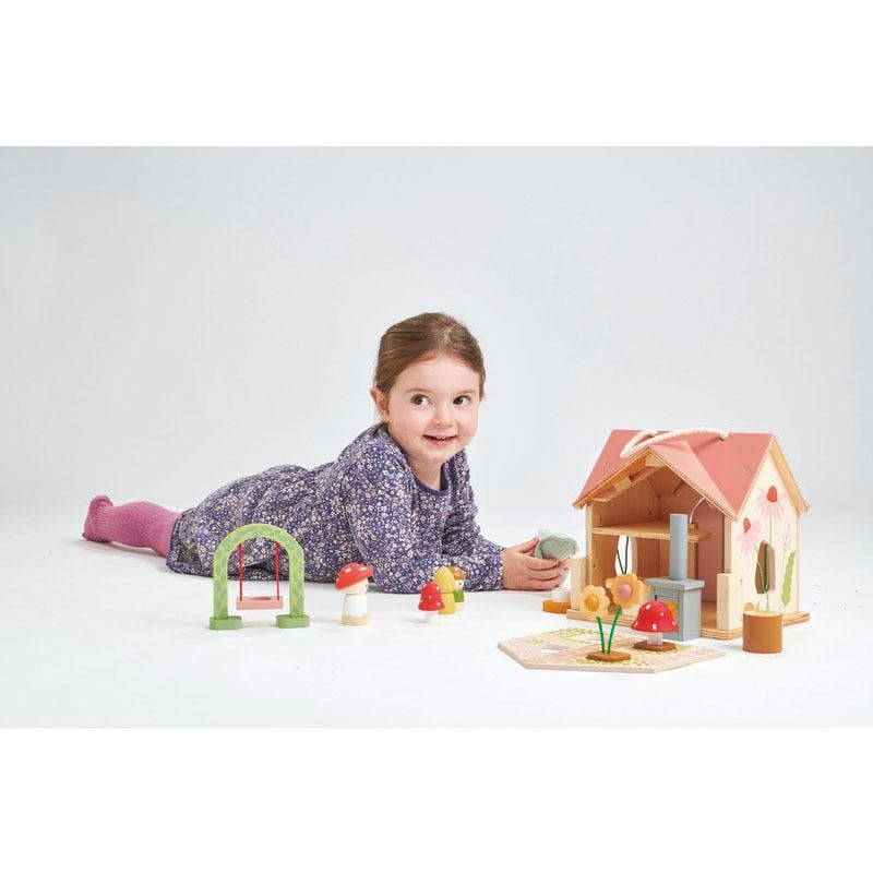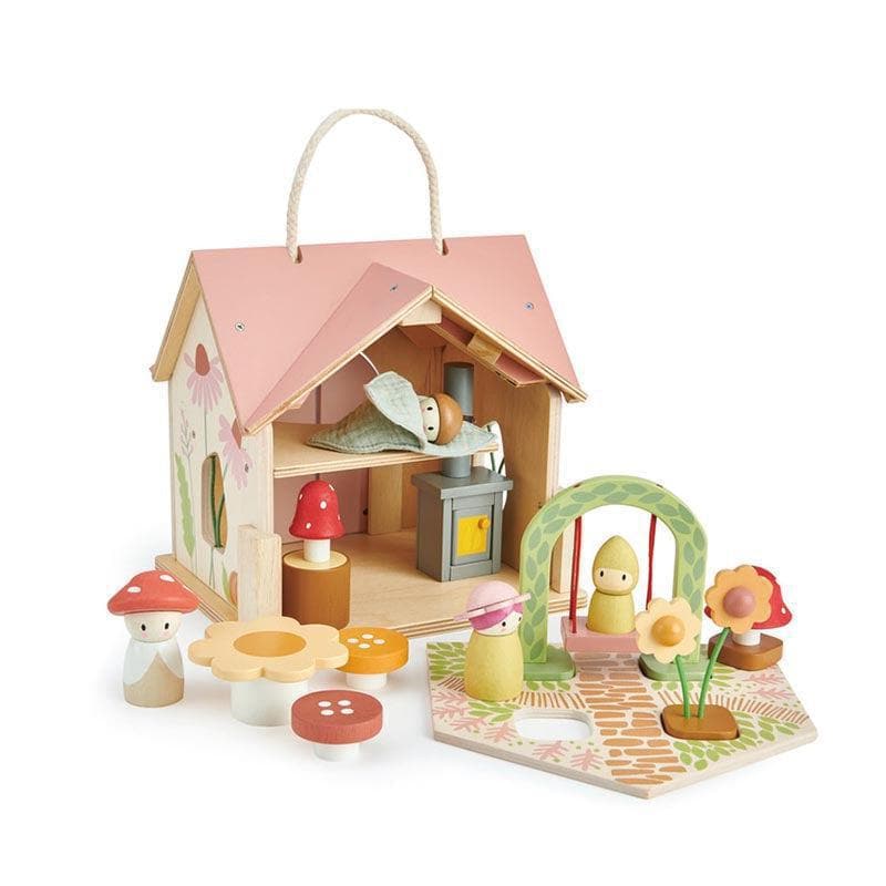 The cutest woodland cottage you ever did see. With a rose coloured gabled roof, opening front doors and a removable back panel, this little house can be carried to be played with anywhere.