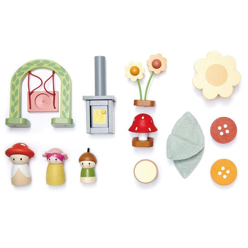Includes 2 wooden flowers, a toadstool and a wooden swing. A wood-burning stove, a table with stools and a lovely bed for baby.