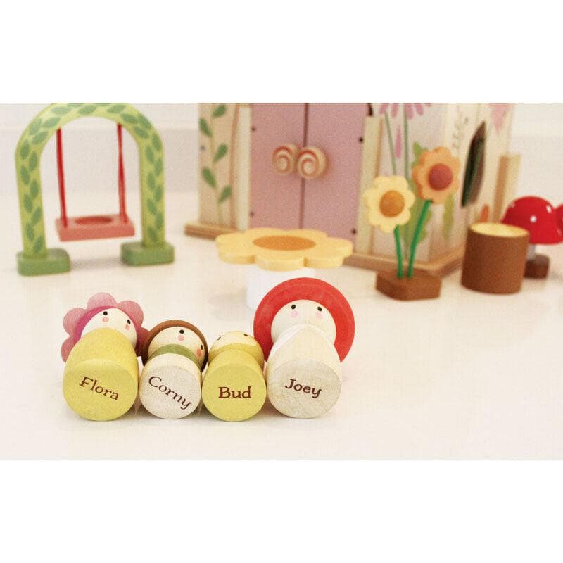 Four wooden characters - Mummy Flora, Daddy Joey, Bud & Corny.