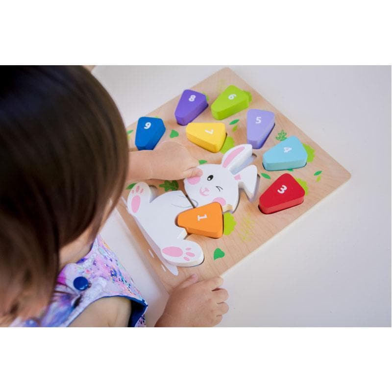 - Asking the child to name the numbers on the carrots as they are being placed into the corresponding numbers on the board and then count from 1 to 10 aloud.