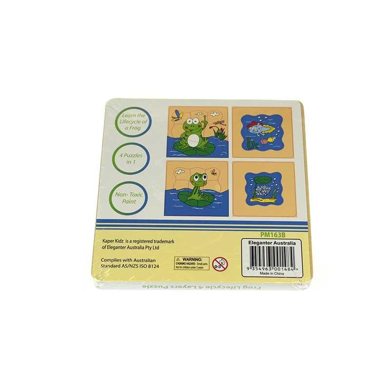 Beautifully made compact puzzle. Build the story of the frog's life as you construct this simple jigsaw puzzle. This puzzle shows the progression of the frog; from an egg to a fully grown frog.