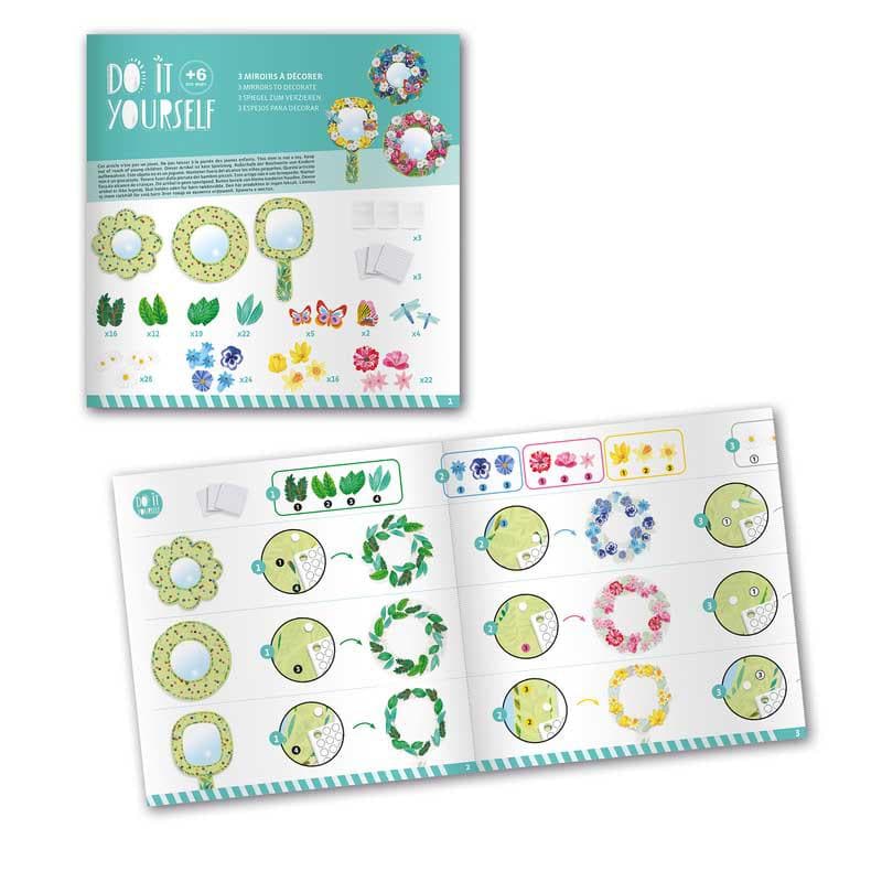 Decorate the 3 small circle acrylic mirrors with the provided flower and leaf foam stickers that children can overlay to look like a wreath. Great for playdates, school holiday activities, birthday parties or crafting days.
