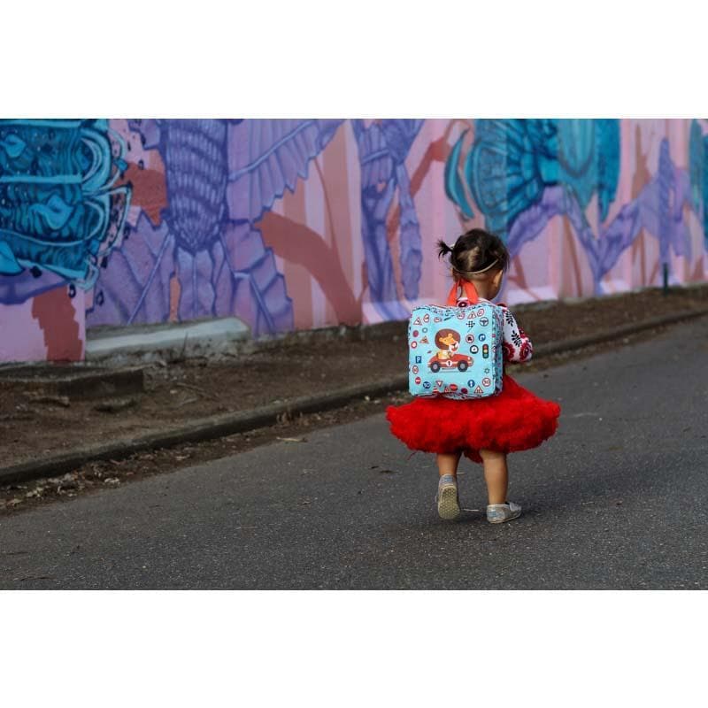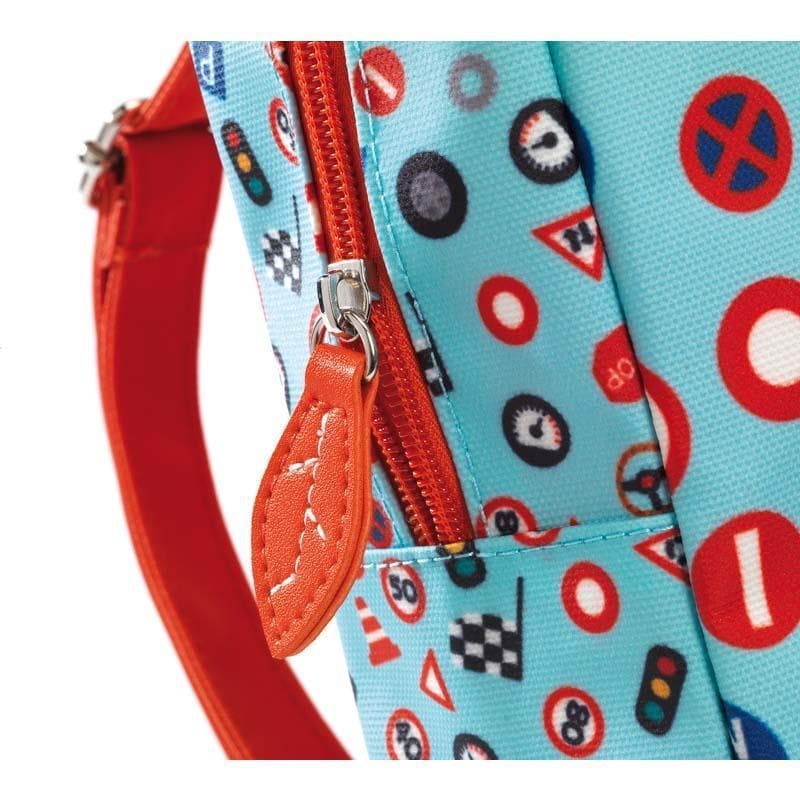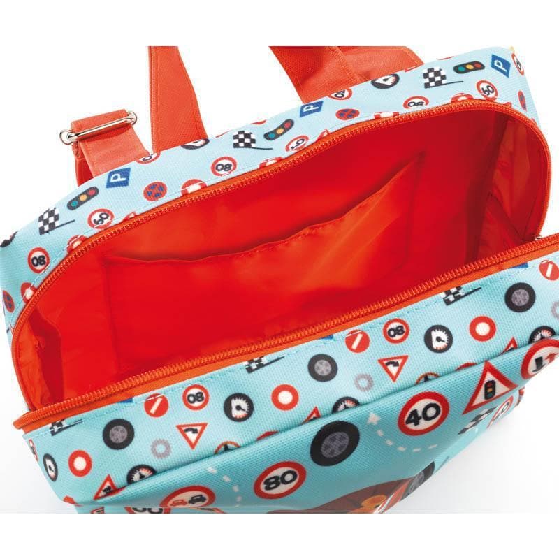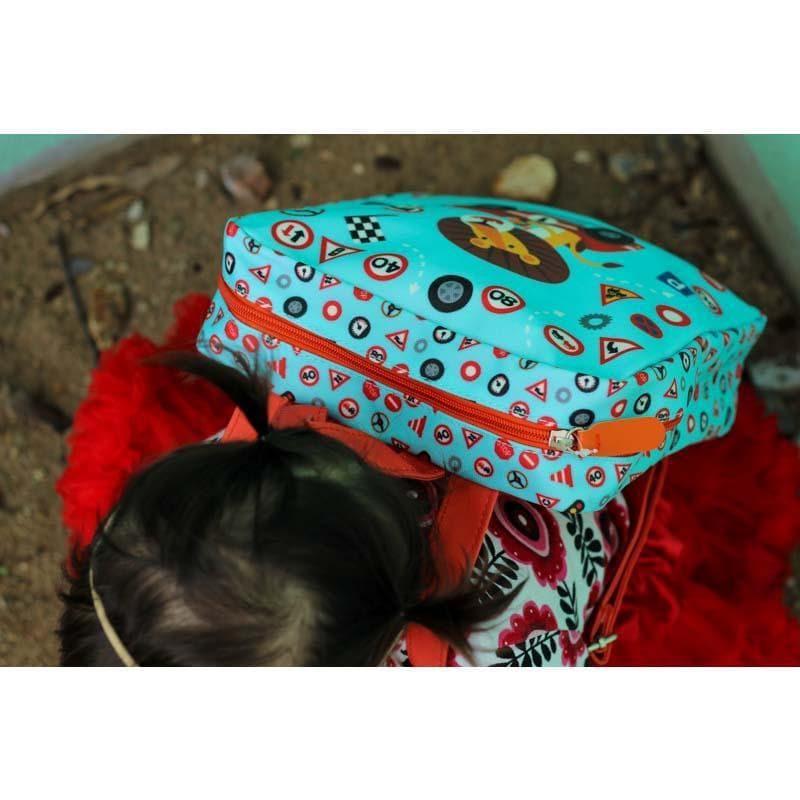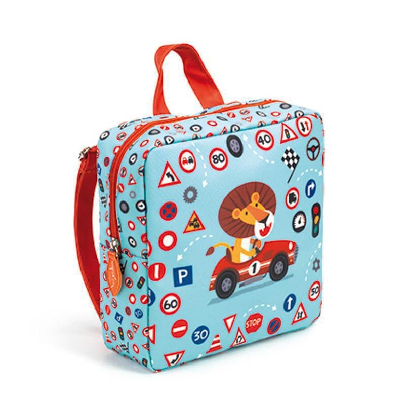 This adorable coated canvas bag is designed with sweet illustrations of a lion in his favourite car. Also features a zip closure, adjustable straps, inner pocket, handle on top and a space for your child's name.