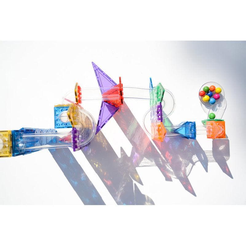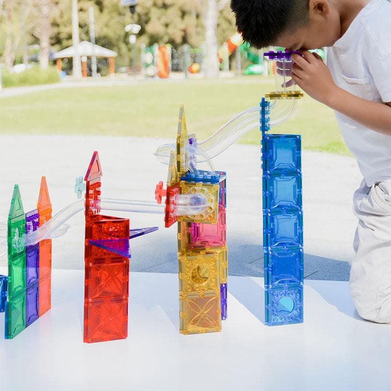 The Magbrix 98 pc ball run is a versatile and unique building toy that offers endless hours of fun for children. It has an open-ended design and allows children to add their favorite building blocks to it while the ball runs through the structure. The connectors are designed to help children improve their fine motor skills as they assemble the pieces with ease and without fear of breaking them. The interlocking system is compatible with other construction toys like Duplo®, making it easy to use. Magbrix is made with 100% safe ABS plastic, a food-grade, non-toxic material that is BPA and phthalate-free.