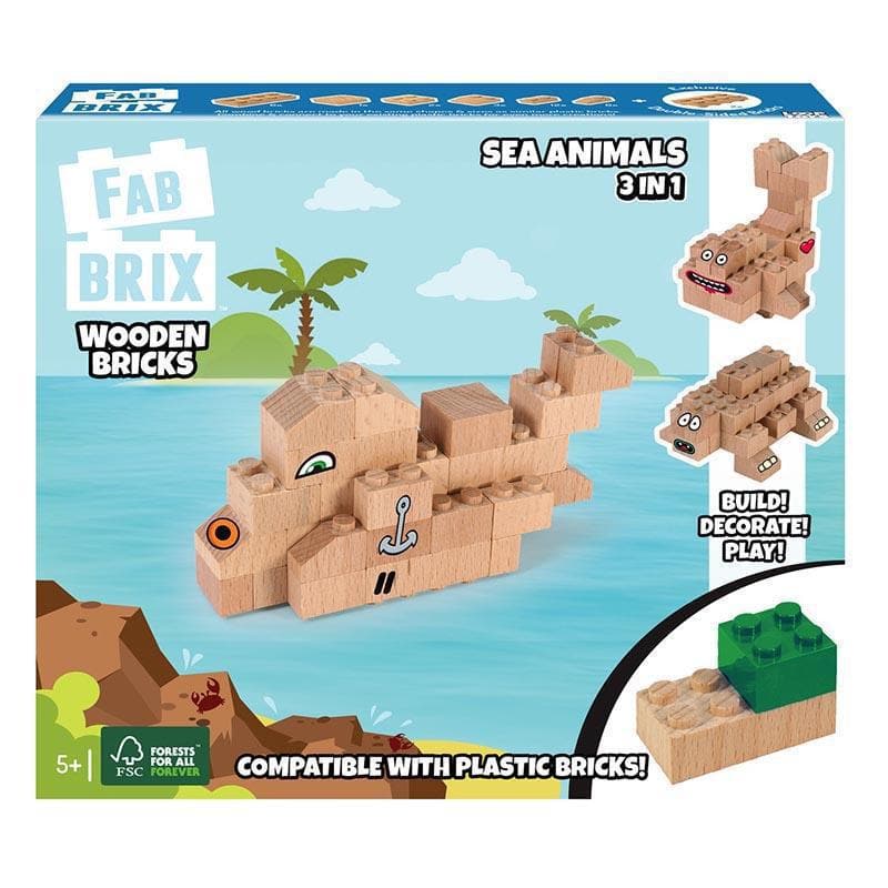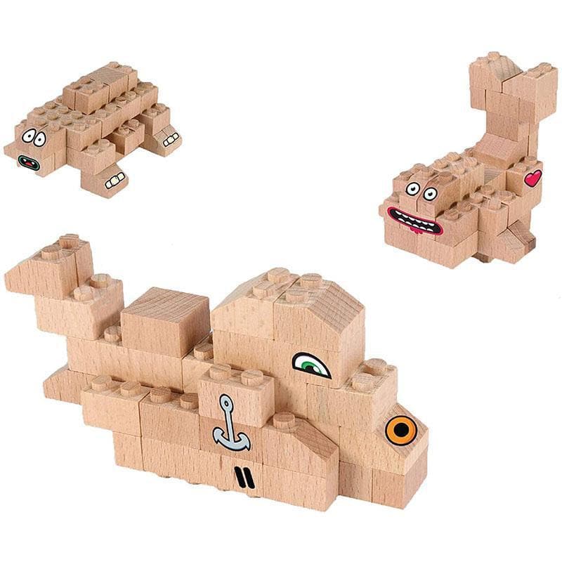 Includes 30 Wooden brix + 2 Exclusive double-sided brix, Sticker sheet, Playmat, Instructions.