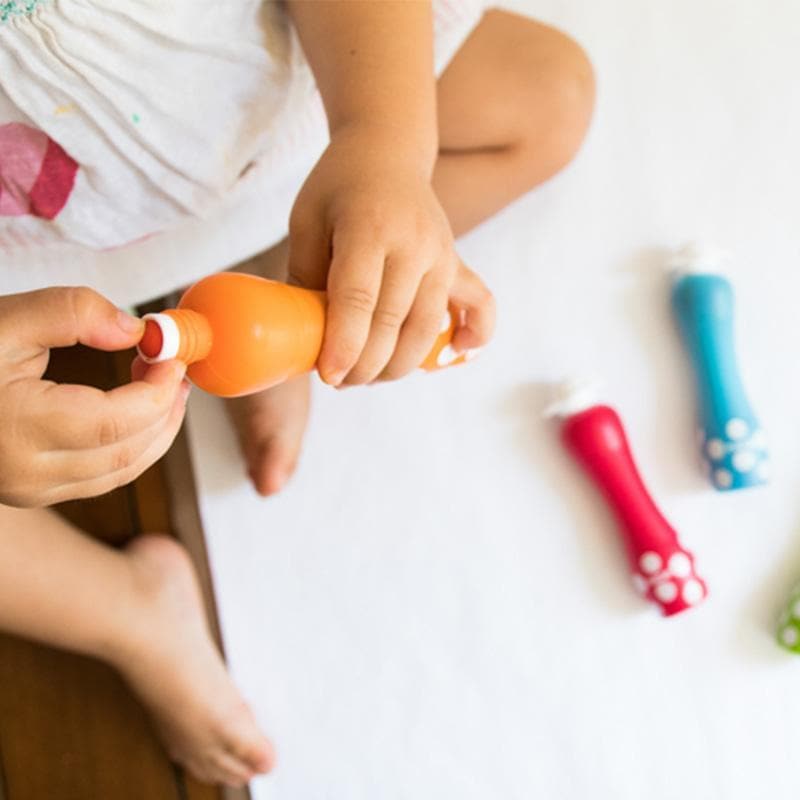Shaped for the perfect grip and featuring bright beautiful colours. Extend learning and play by standing up the colours and knocking down the "blue" colour. Children can also build their fine motor skills while screwing the cap back on.