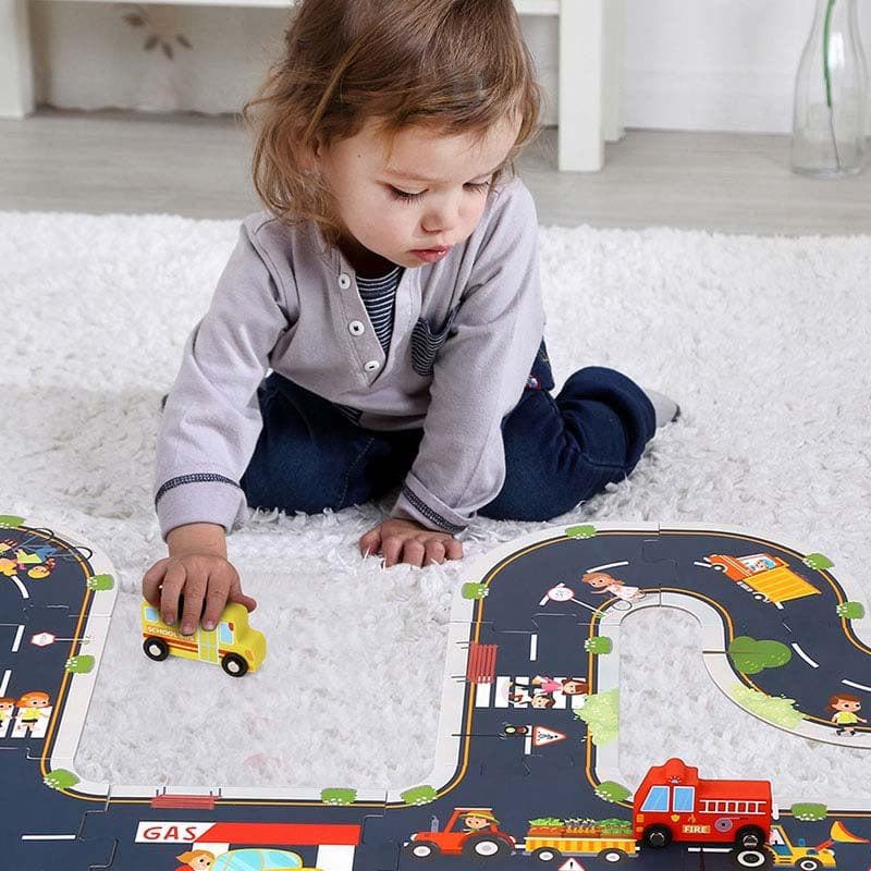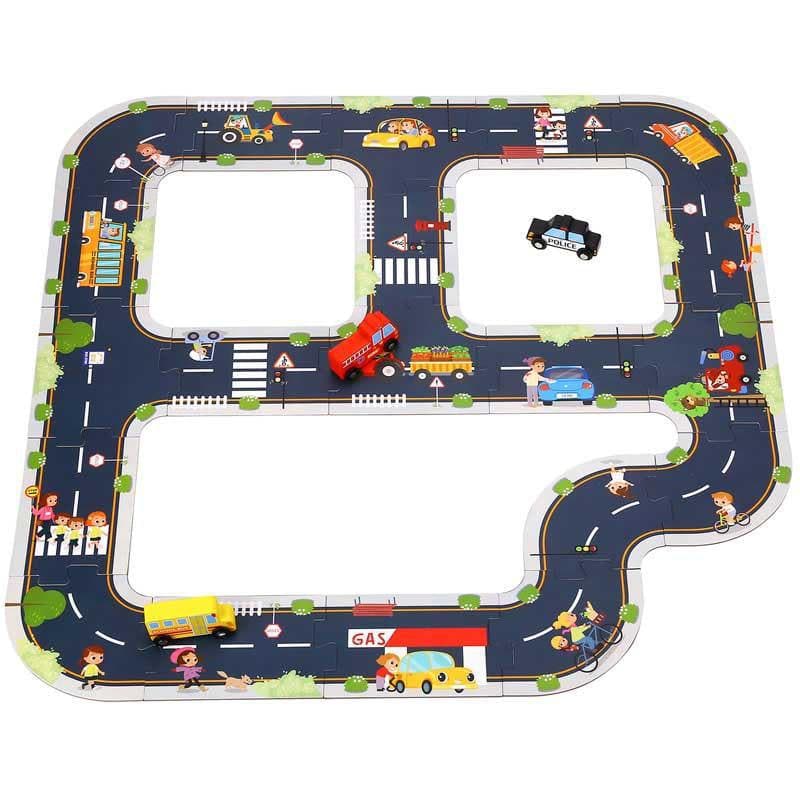 City Road Puzzle has 20 heavy-duty cardboard road pieces 2mm thick that can be designed into different layouts.