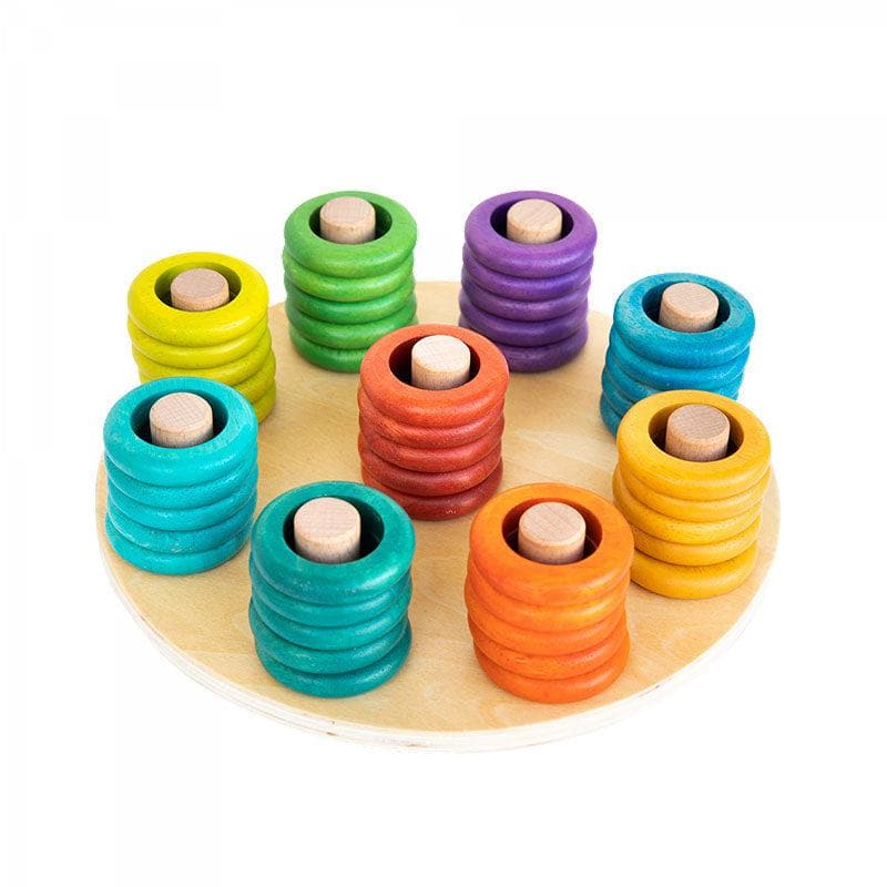 The sky is the limit with the range of play activities available with this unique and open-ended wooden set. Beautifully made with 9 bright and engaging colours [5 rings in each colour] children can design masterpieces by stacking the rings in colour order or create patterns using their own imagination.