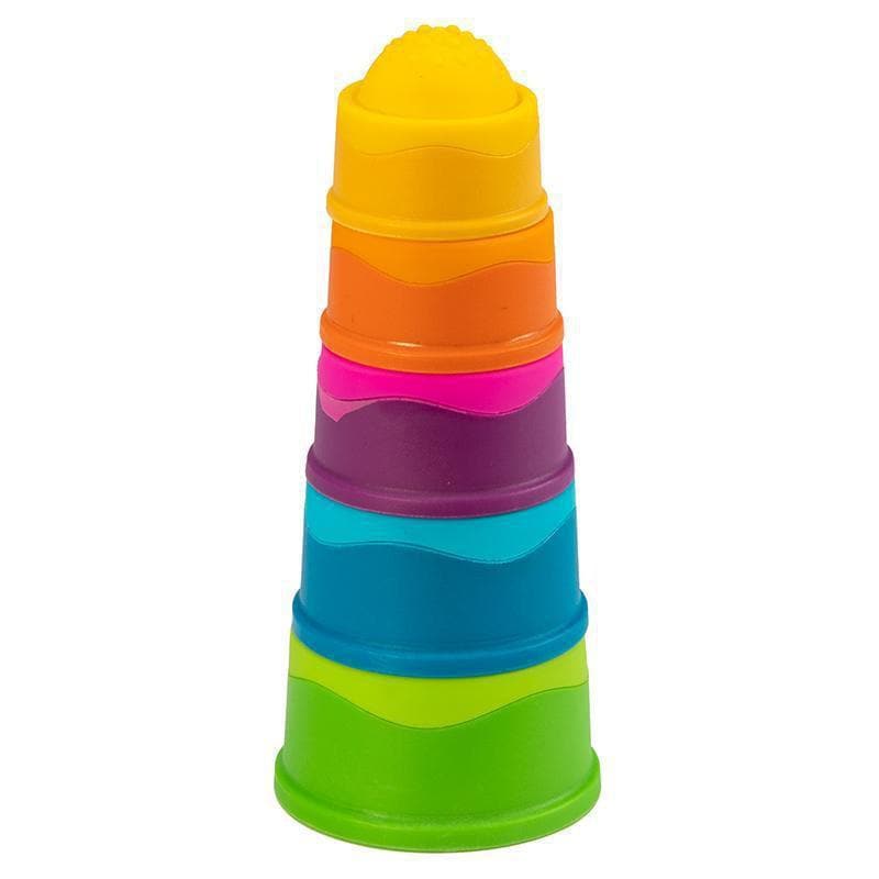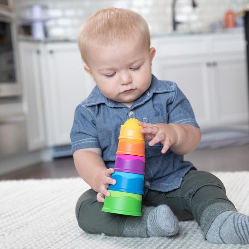 Looking for some fun toys to help improve your little one’s fine motor skills? Say hello to the Dimpl Stack from Fat Brain Toys! Featuring five squishy silicone cups, the Dimpl Stack’s stackable nature engages curious, growing minds while also offering hours of fun for your child. The top of each cup features embossed silicone bubbles for a unique texture — little fingers will love to touch, push and pop them again and again.