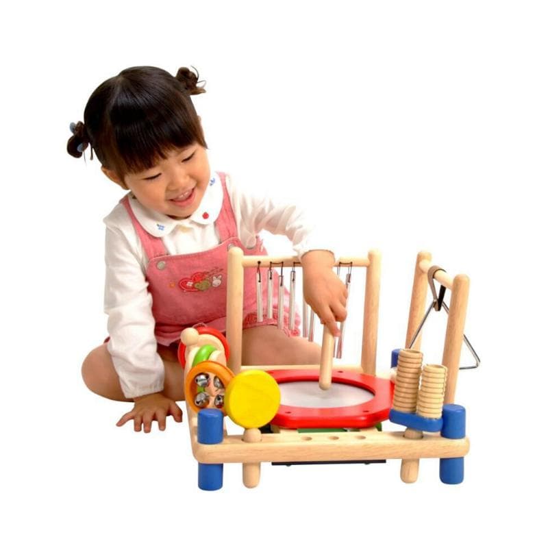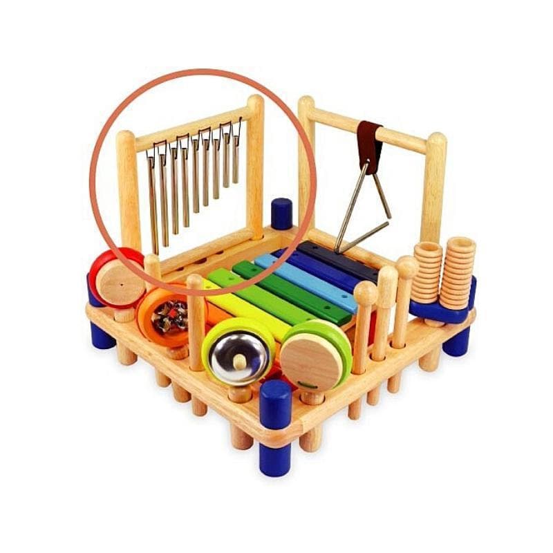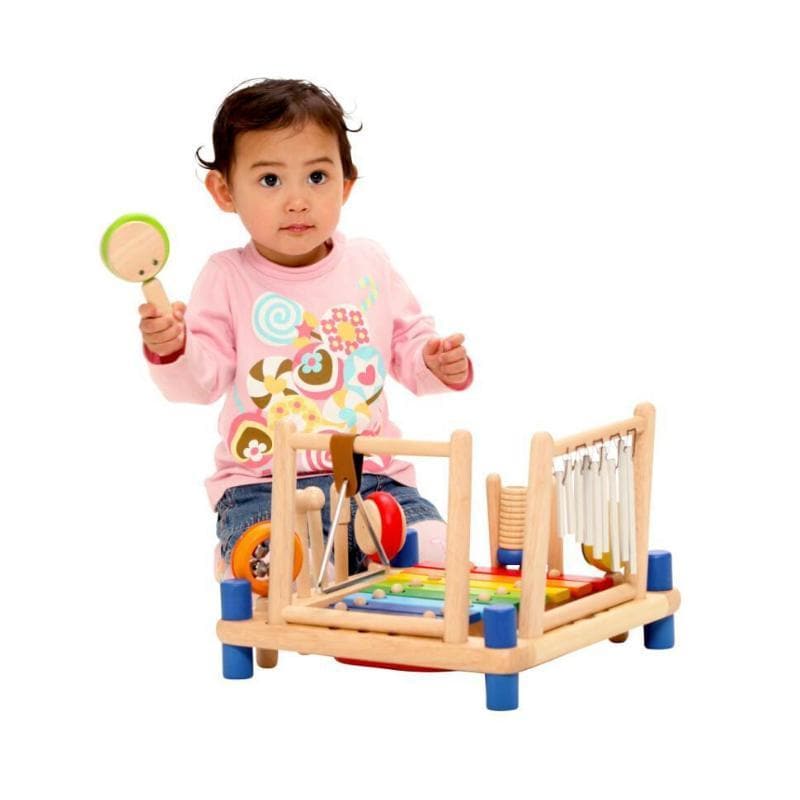10 different sound and music experiences in a sturdy rubberwood frame. Includes xylophone, drum, tubular chimes, triangle, cymbal, bells, maracas, castanet, double guiro, pair of rhythm sticks plus 2 strikers and 1 scraper. Every part is stored in its own dedicated slot around the frame but can be flat packed for easy storage. Flip the main frame to reveal a colourful drum.