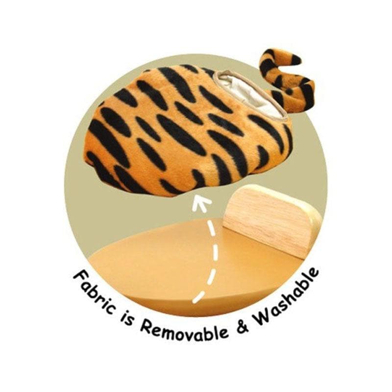 A ride-on tiger in a sturdy wooden trike configuration with a steerable front wheel and a comfortable seat. The seat cushion is removable and washable.