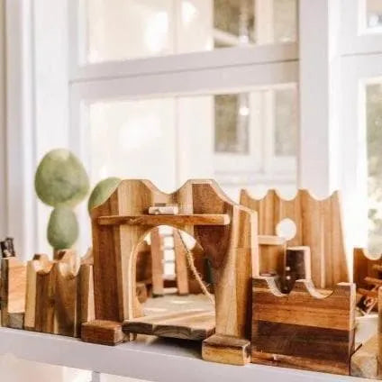 Handcrafted in Vietnam, this solid-wood castle building set is truly an heirloom toy. The set includes a working drawbridge, arched doorways, castle walls, and 2 ladders. Pieces can be rearranged to build any number of creative castle structures.