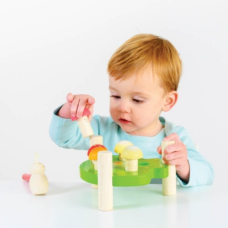 A fun adorable hammer game. Mr Mushrooms is a wooden hammer game with funny faces on the mushrooms and comes with an adorable bunny hammer. This toy encourages manual dexterity and hand-eye coordination.