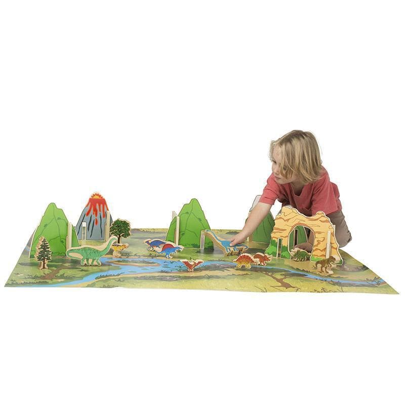 Watch the dinosaurs come alive with this colourful prehistoric small world wooden set that comes complete with a prehistoric landscape of mountains, a volcano, trees and cliffs with a cave.