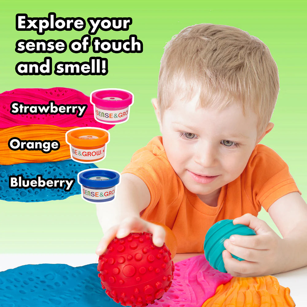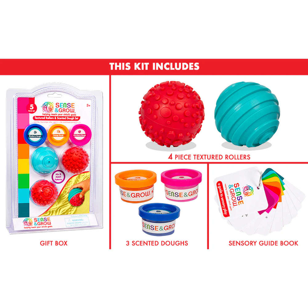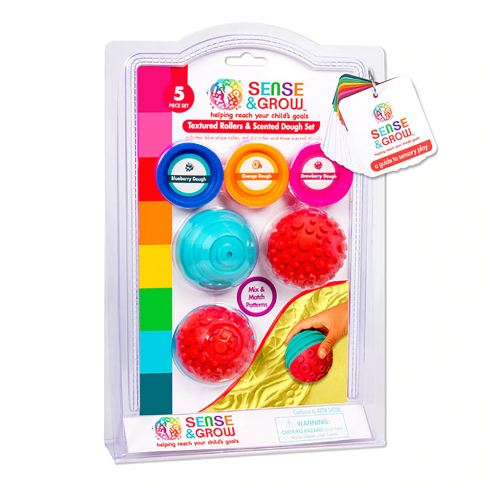 This is one of the most fun sets in the entire Sense & Grow line. The idea here is that children are working on various parts of their development as they play. This set is great for imaginative play, creative thinking, hand-eye coordination, and more! So, yes, they will be laughing, smiling, and having fun, but they will also be working on key skills as they do. The Sense & Grow Mix & Match Sensory Textured Rollers & Scented Dough Set comes with three different pots of child-safe dough. In keeping with the senses theme of this set, each pot has a different colour and scent. There is berry, orange, and strawberry. Each time they open a pot it is a real blast to the sense!