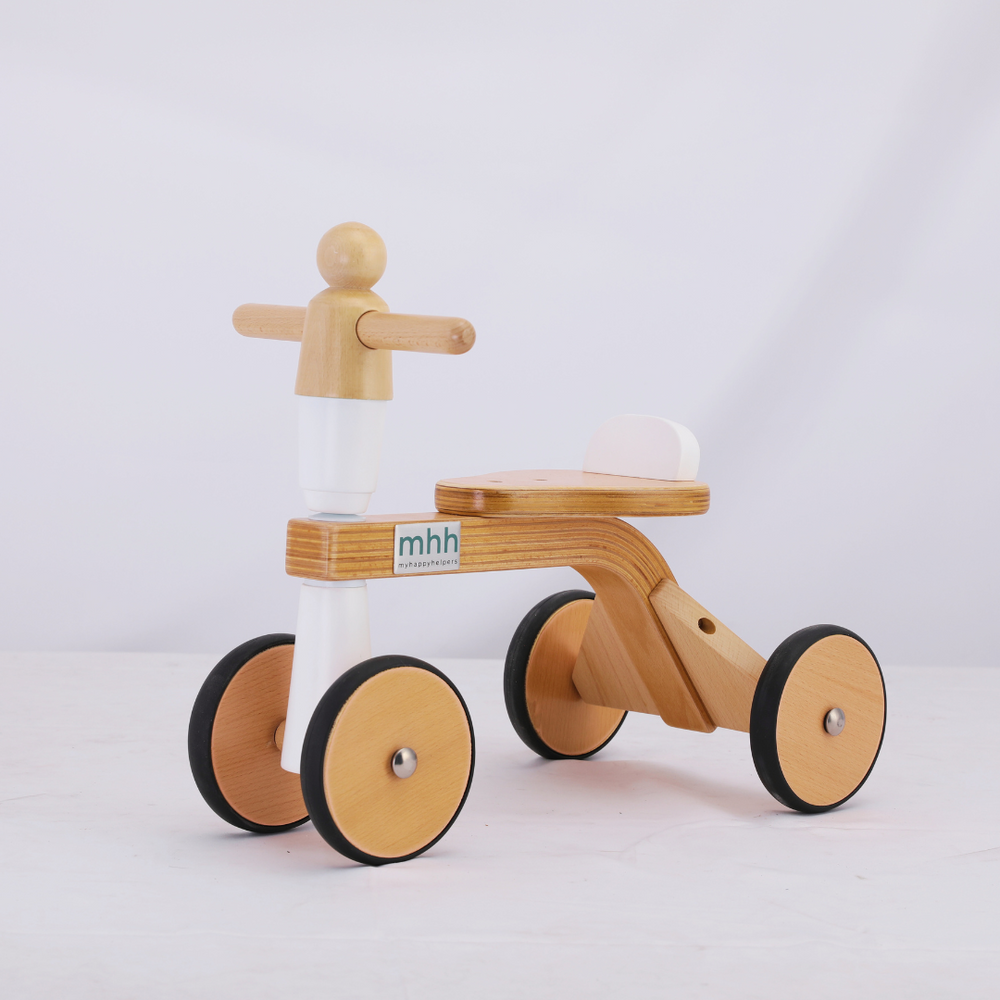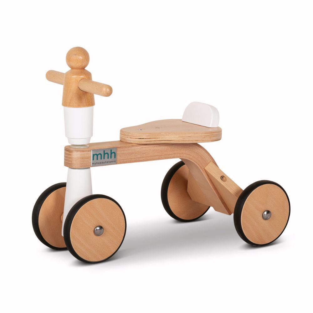 This delightful wooden ride on is stylish and sturdy, with a steerable front wheel and a wooden seat.