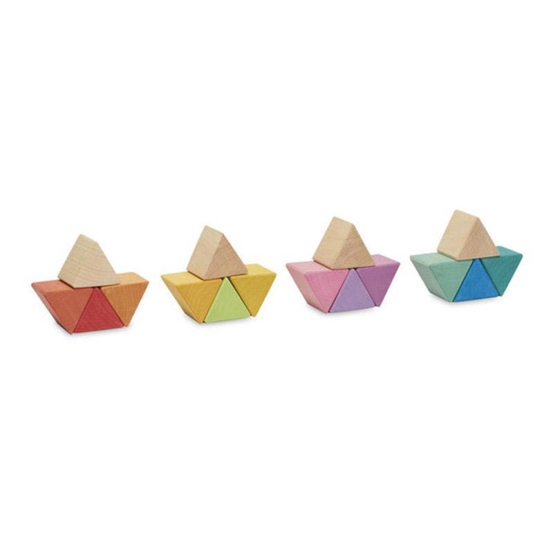 A wonderful set of 12 coloured building blocks in a wooden frame. A great introduction set for children that want to discover geometric forms through stacking.