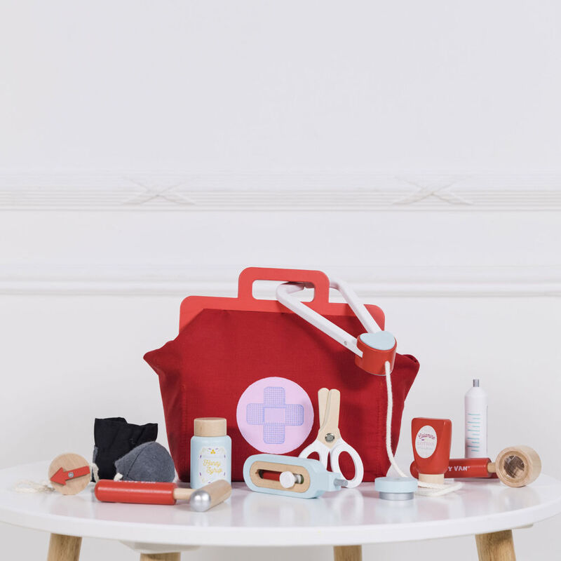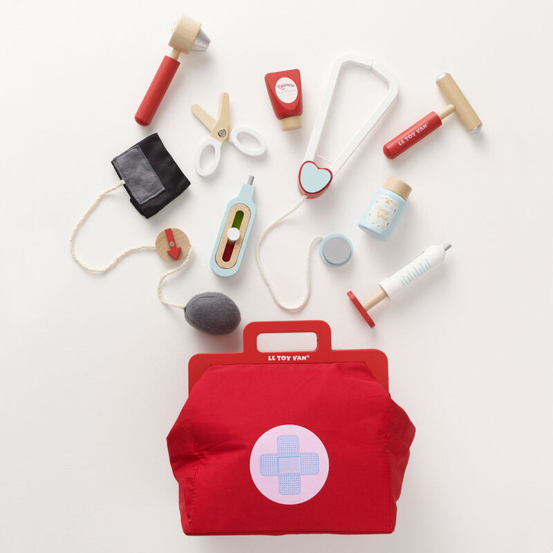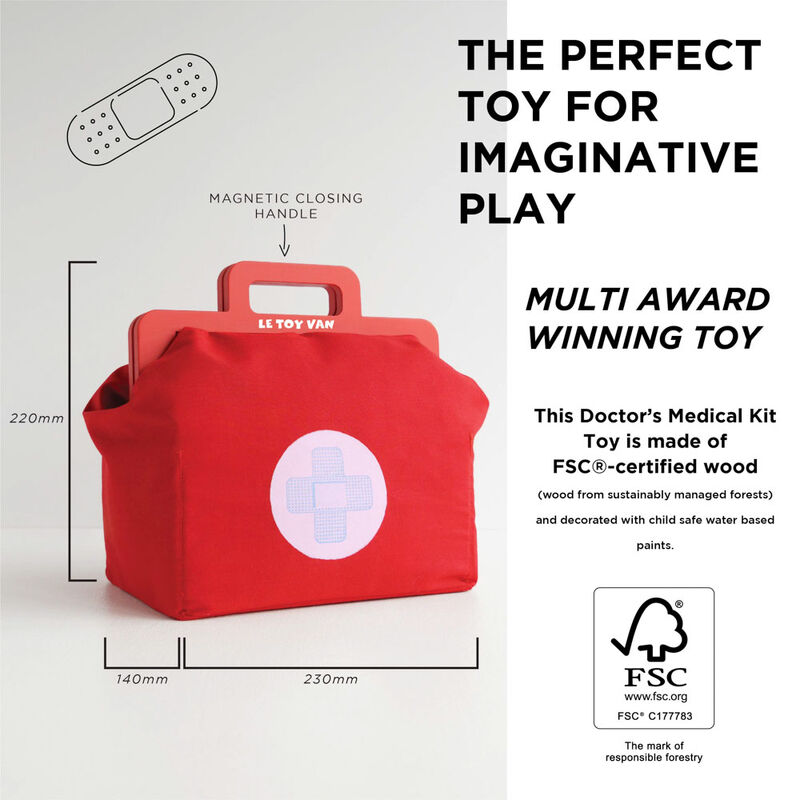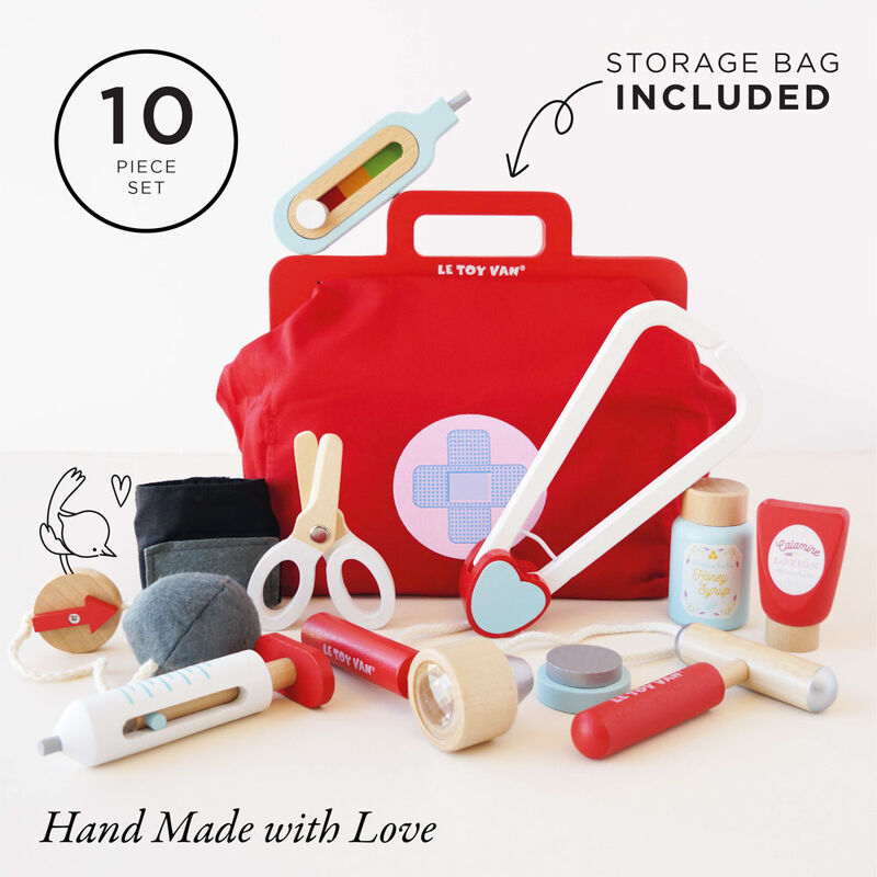 Inspire hours of imaginative play with this charming wooden Doctor's Set. Featuring a vintage-style red fabric bag and nine colourful wooden accessories, it’s perfect for encouraging empathy, creativity, and social interaction. Built to last, this timeless toy supports early development through hands-on role play.