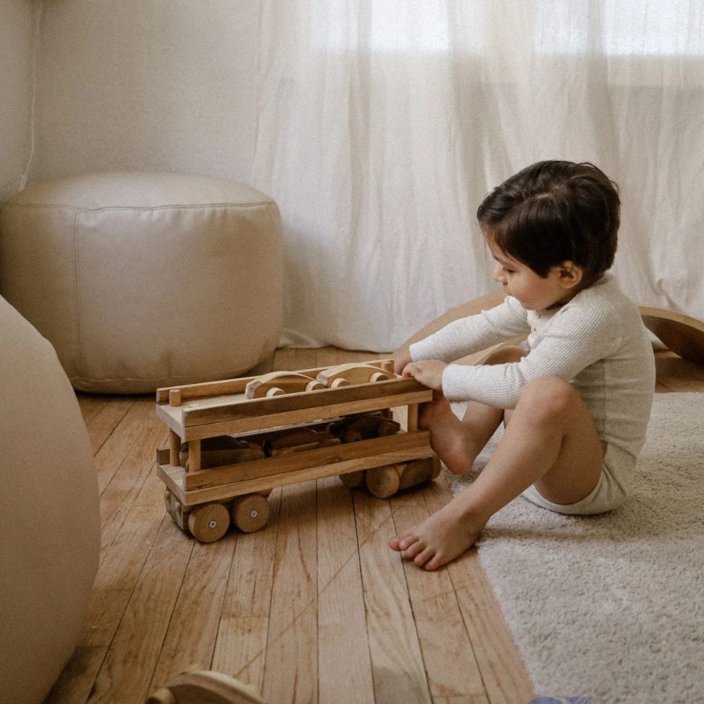 Beautifully crafted that includes six wooden cars and a detachable trailer, this transport truck is a great addition to the playroom. It encourages hours of imaginative and open-ended play.