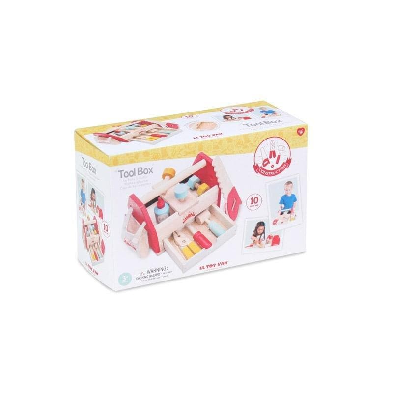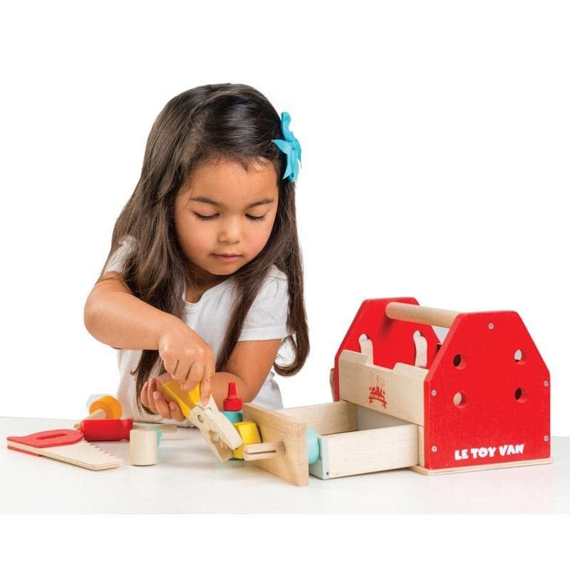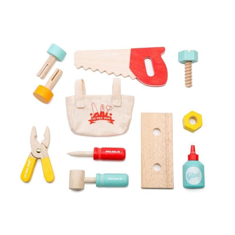 Busy builders will be proud of their Le Toy Van Tool Box. Complete with 11 accessories: a fabric bag, pliers, a screwdriver, a plank of wood with two holes, two nails, a bolt, a screw, wood glue and a hammer.