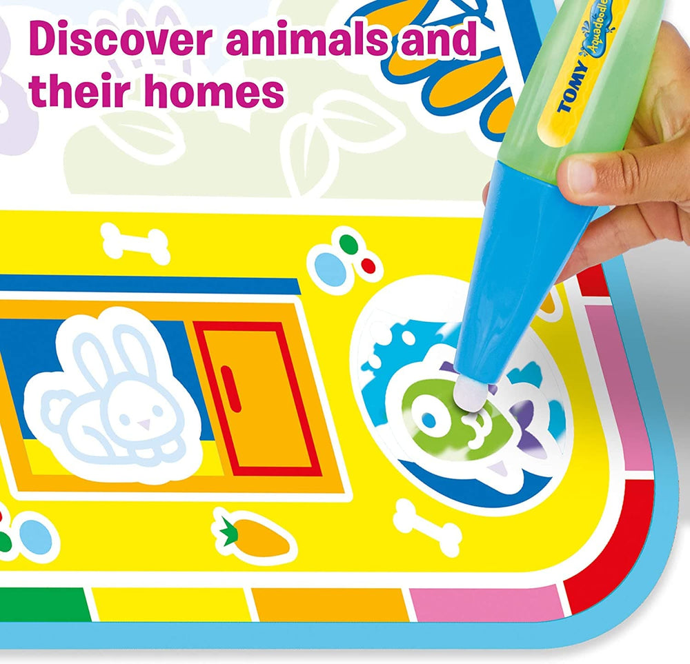 Aquadoodle's My First Discovery is the perfect solution for keeping kids entertained on the go, with none of the mess you normally associate with paints, pens or watercolours. The secret is in the mat Simply fill your Aquadoodle pen with ordinary tap water, run the nib over the magic mat and see the colour appear.