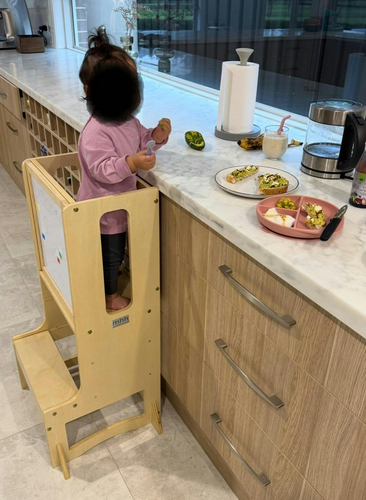 As for the open side — Learning Towers are Montessori-inspired, designed to promote independence by allowing little ones to climb in and out safely.