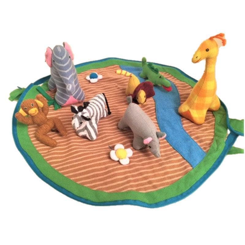 This ingenious pouch becomes the play mat for the six animals that live inside.