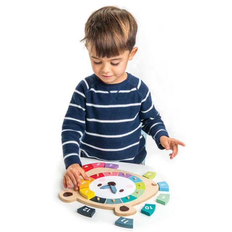 There is so much to learn with this clock while having fun. Learn to tell the time and understand how time works. This clock also teaches colour recognition as children can match the colours of the blocks.