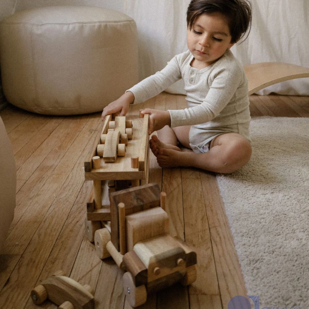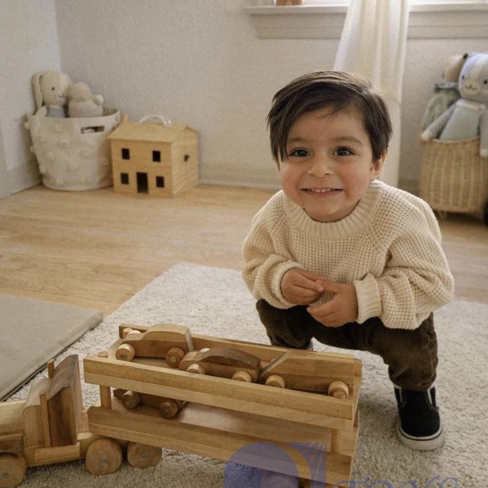 Beautifully crafted that includes six wooden cars and a detachable trailer, this transport truck is a great addition to the playroom. It encourages hours of imaginative and open-ended play.