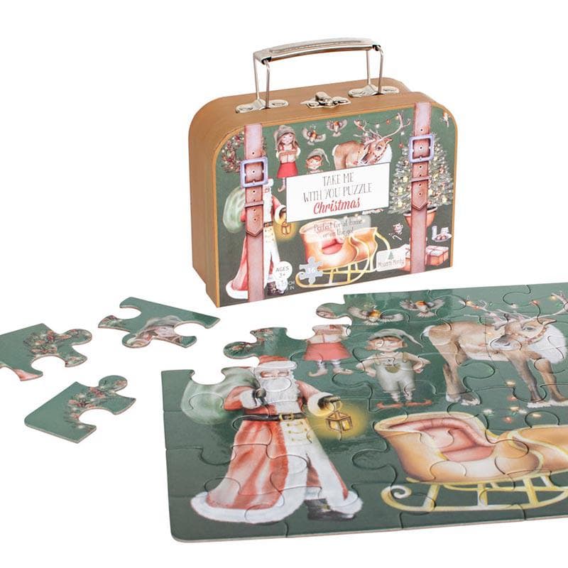 Our Christmas "Take Me With You" Puzzle is a stunning 36-piece jigsaw puzzle, packaged in the sweetest mini suitcase with a durable metal handle and latch. The finished puzzle is 31 x 23cms, which fits on most plane and train tray tables. Your little one will love to carry their little suitcase on short adventures out of the house too, making it perfect for cafe visits or playdates.