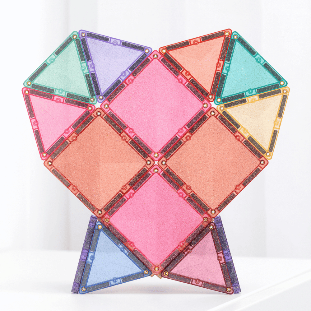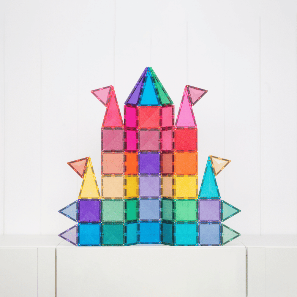 Designed for big imaginations and fairytale explorers, our stunning glitter tiles in signature pastel and vibrant rainbow colours add a touch of magic to every build. Featuring squares, plus a mix of isosceles and equilateral triangles all bursting with multi-coloured sparkles, this open-ended pack is perfect for building shimmering castles, towers, bridges, animals and so much more!