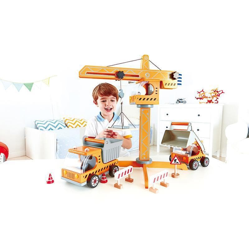 Future builders put their imagination into play when erecting a construction site with this crane set. Let the little planner describe the scene while setting up each piece. An essential piece to all building site play settings!