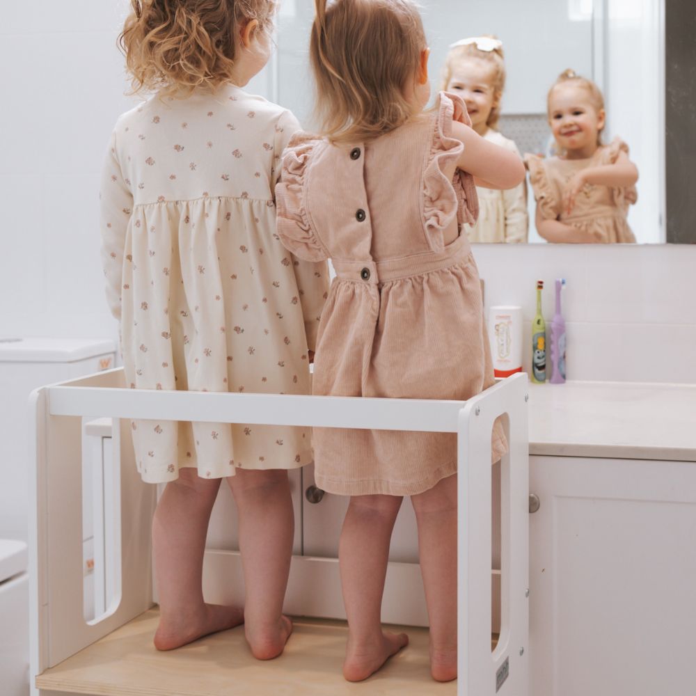 The My Happy Helpers Learning Tower Range grows with your child. The top platform can be easily adjusted to accommodate the height of each child. Designed for supervised use from 12 months onwards, the double learning tower is adaptable to suit your growing children's needs.