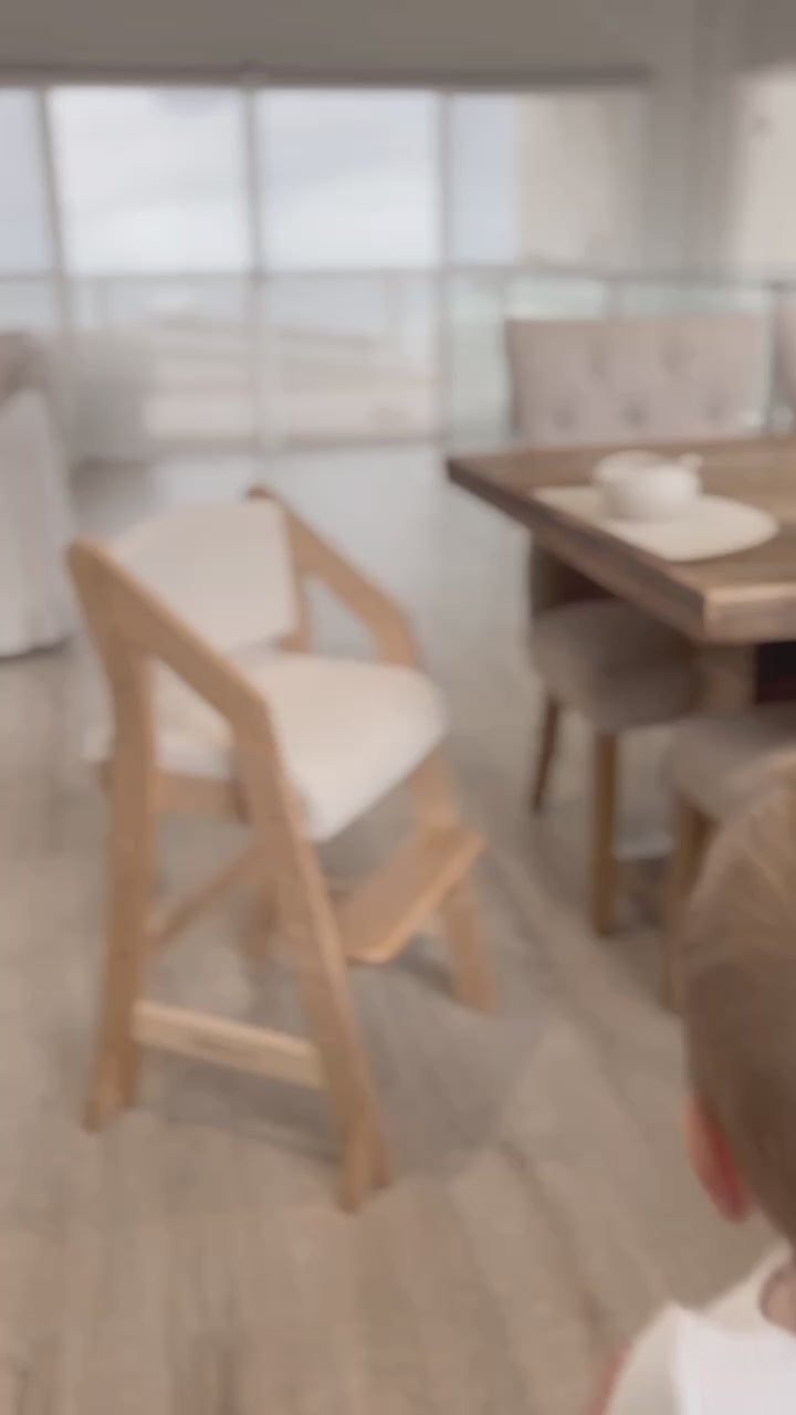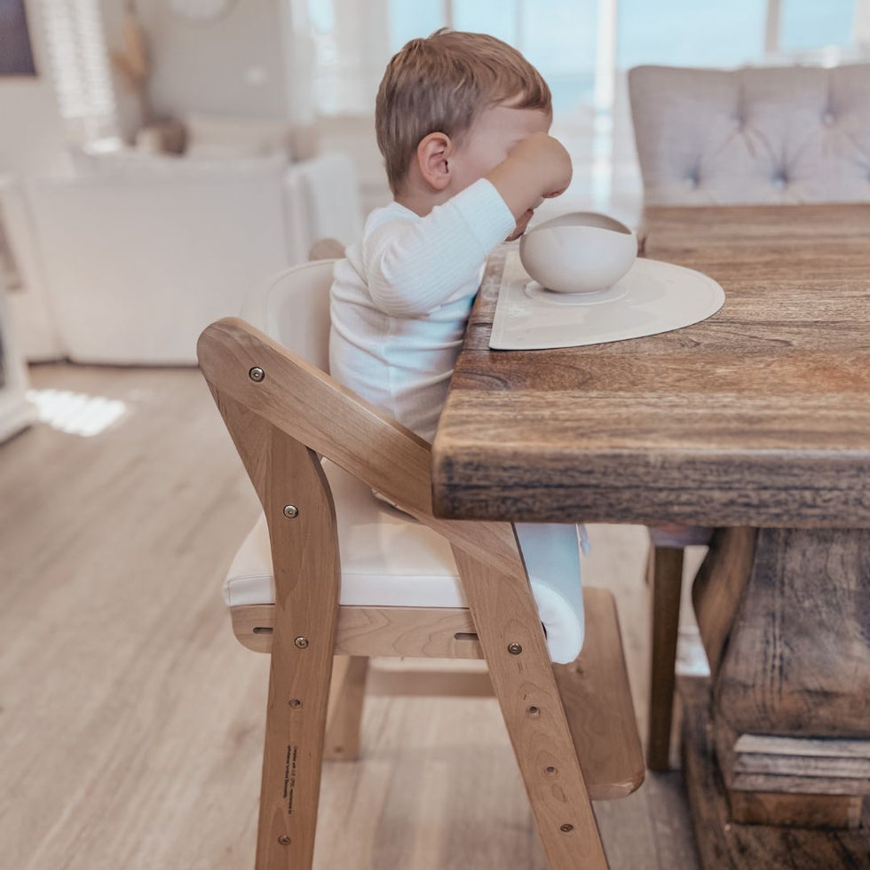 A considered transition chair for children who have outgrown a high chair but still need secure, supported seating at the table.