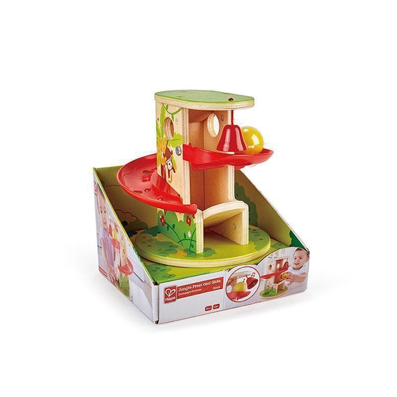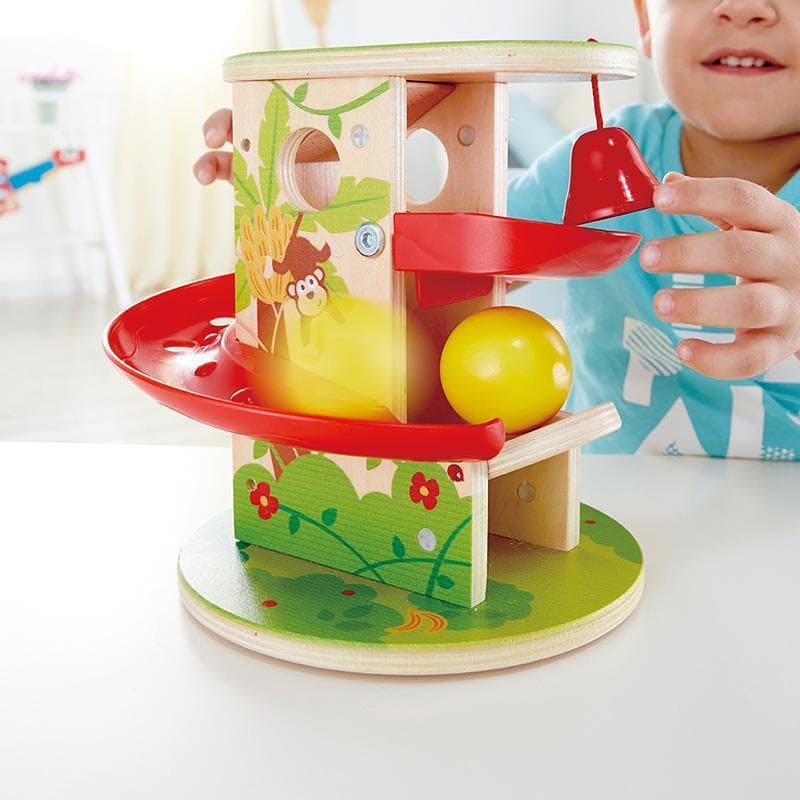 Sliding is fun! Make the wooden ball race around the tree to the jungle floor. Then press the lever to start all over again! Press the lever to launch the ball onto the slide so it rings the bell. Then press to go again and again!