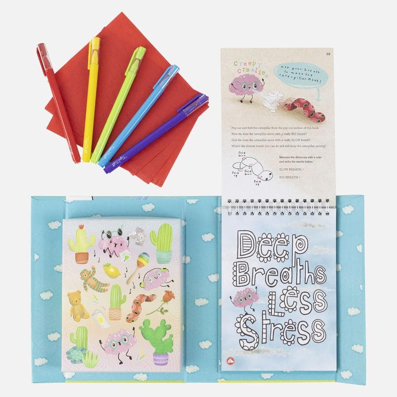 Each set includes 45 page mindfulness guide book; 5x coloured gel pens, 3x sheets red tissue paper, 5x pop out activity pages, 2x sticker sheets.