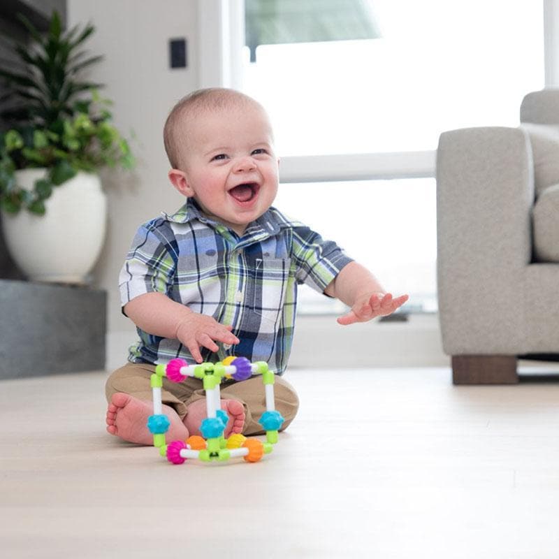 Each edge is connected by elastic bands to allow little hands to bend it and twist it this way and that. Meanwhile, the rubbery textured beads spin and slide for an extra boost of sensory fascination