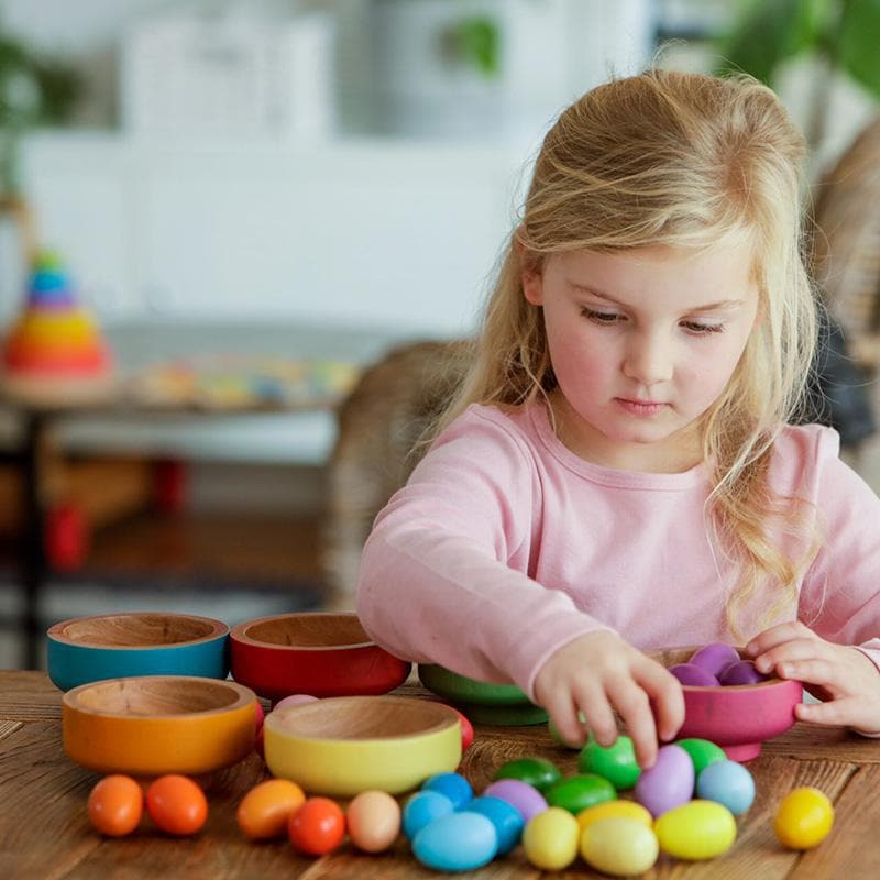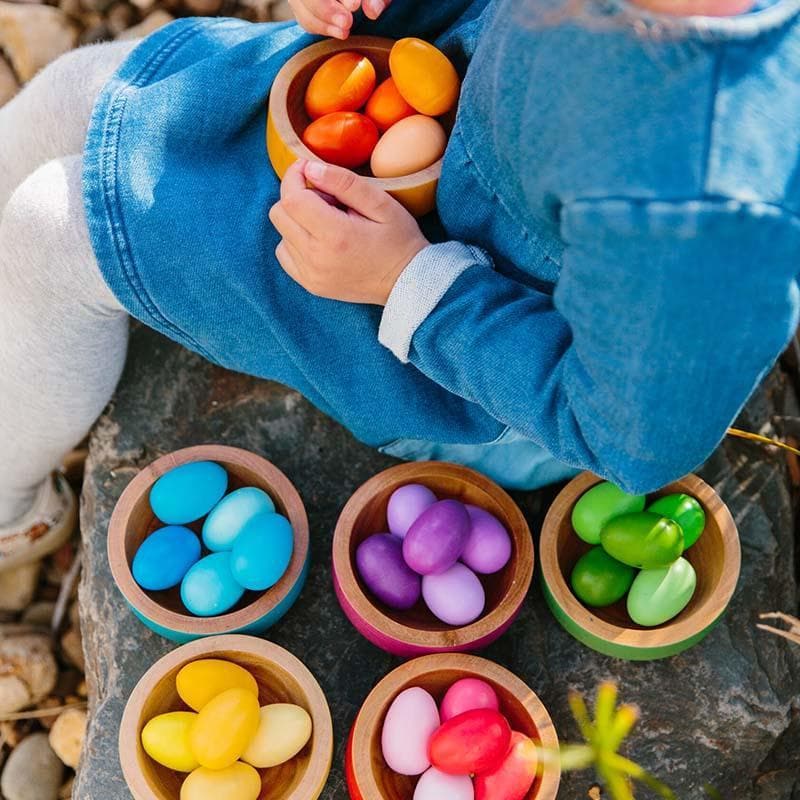 This set consists of 30 eggs representing a variety of shades and colours of the rainbow. The corresponding nest bowls provide the perfect complementary sorting receptacle. The bowls are also stackable, adding more learning possibilities to the play.