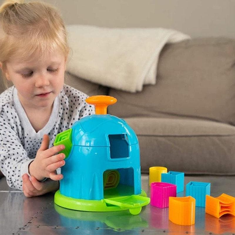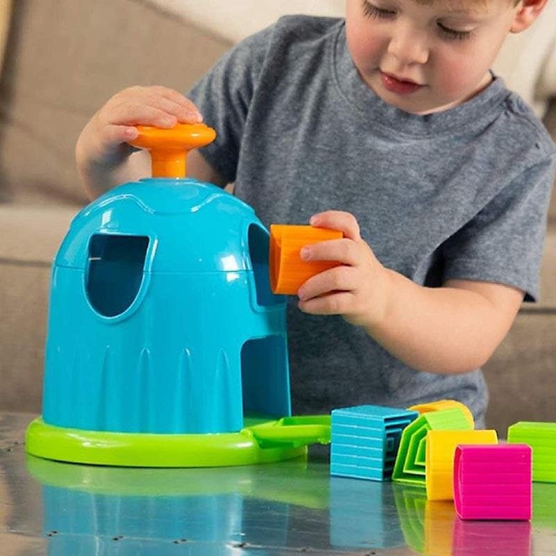 With a push of the button, the top twists and the slots all change. Kids have to explore and experiment to solve the puzzle and match all the shapes!