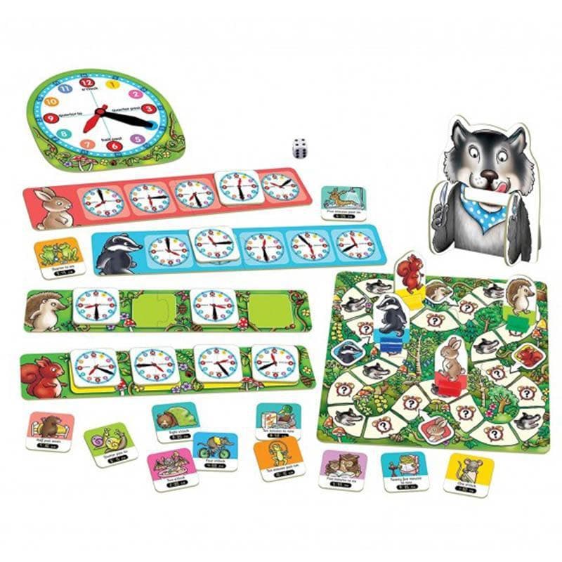 Players must race their character around the board matching the times to the central clock - but watch out for the hungry wolf!